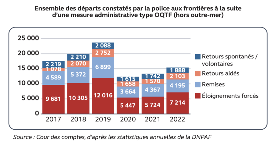 - Depuis août 2022, le ministère de l’Intérieur a demandé à ce que les profils des étrangers présentant des troubles à l’ordre public (TOP) soient en priorité expulsés. « Même si l’éloignement de certains d’entre eux, originaires de pays en guerre ou en très forte instabilité, ne sera souvent pas possible » note le rapport de la Cour des comptes de 2024. Et continuer : « La définition des profils “TOP” n’est toutefois pas formalisée ni partagée entre les services. Il apparaît désormais nécessaire de mieux identifier ces personnes présentant des troubles à l’ordre public dans les systèmes d’information et de mieux suivre leur éloignement effectif ».