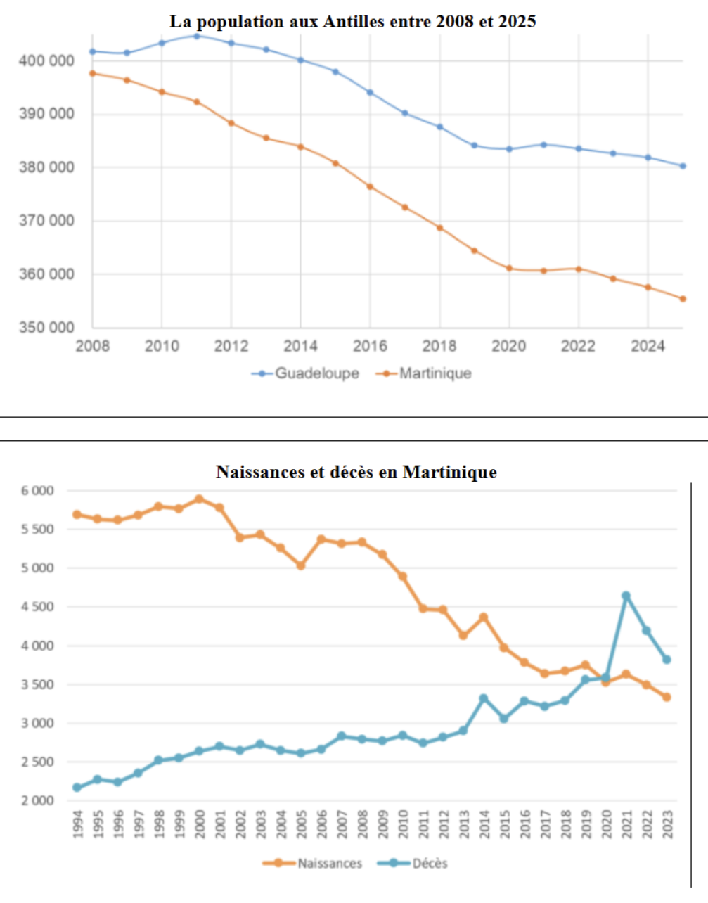 Situation démographique : Selon le dernier recensement INSEE (2022), La Martinique compte 361 019 habitants. Sa population avoisine les 356 000 habitants selon le rapport de l’Assemblée nationale sur la situation démographique des outre-mer (janvier 2025).