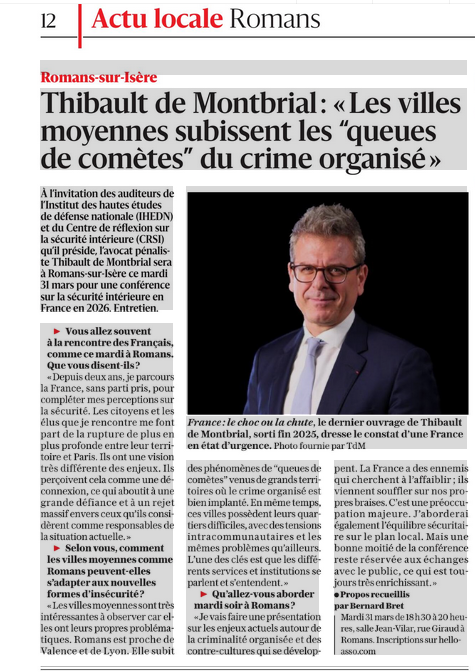 À l’invitation des auditeurs de l’Institut des Hautes Études de Défense Nationale (IHEDN) et du Centre de réflexion sur la Sécurité Intérieure (CRSI) qu’il préside, l’avocat pénaliste Thibault de Montbrial sera à Romans-sur-Isère ce mardi 31 mars pour une conférence sur la sécurité intérieure en France en 2026. Entretien.
