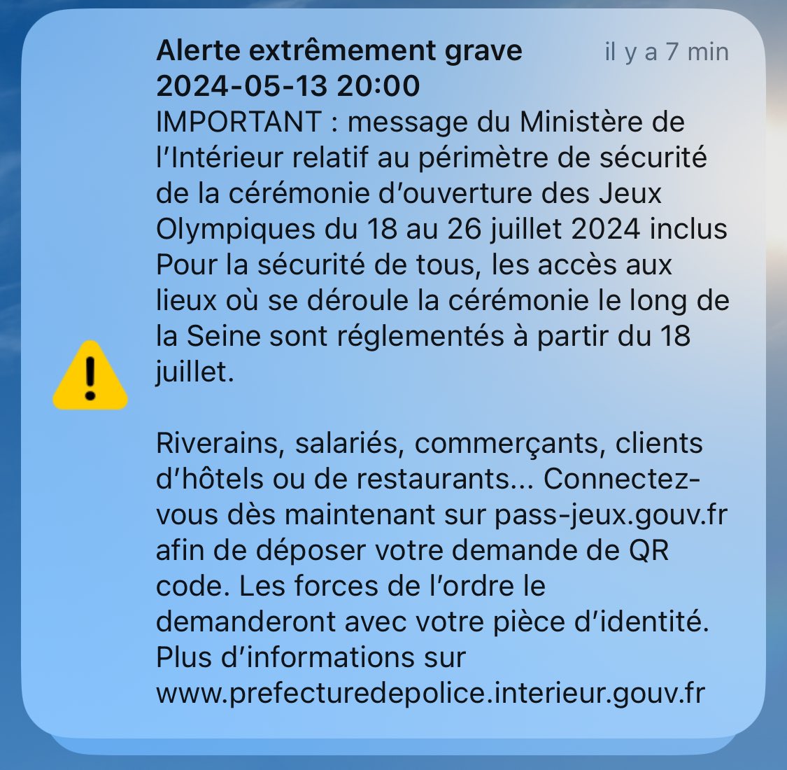 Lundi 13 mai à 20h00, un message intitulé « Alerte extrêmement grave » a été diffusé sur les téléphones portables des Parisiens se trouvant dans le périmètre de sécurité des Jeux olympiques.