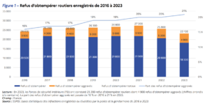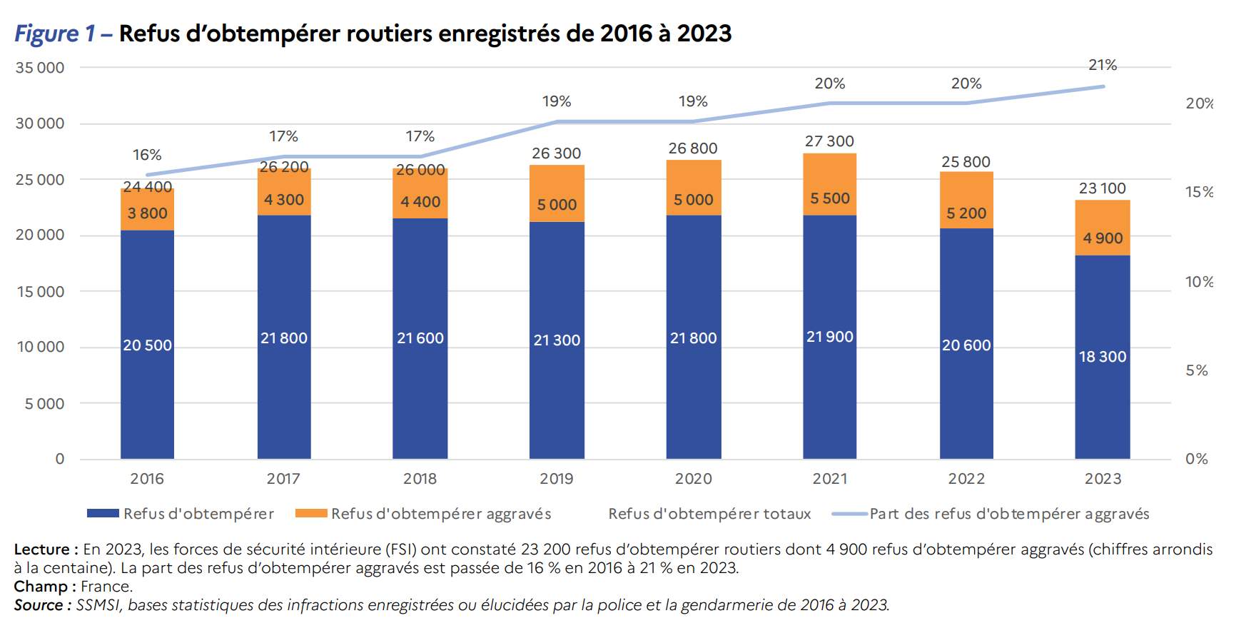 Sur la période 2016 – 2023, les forces de sécurité intérieure ont constaté 25.700 délits de refus d’obtempérer  routiers en moyenne par an. Ces derniers ont légèrement diminué sur la période (-5 %), avec une hausse entre  2016 et 2021, suivie d’une baisse de 2021 à 2023.