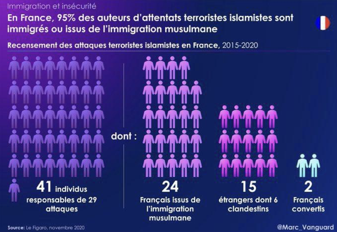 À noter que 63% des terroristes islamistes de ces dernières années sont français. Mais 58% de ces français sont des descendants d’immigrés issus de pays musulmans.