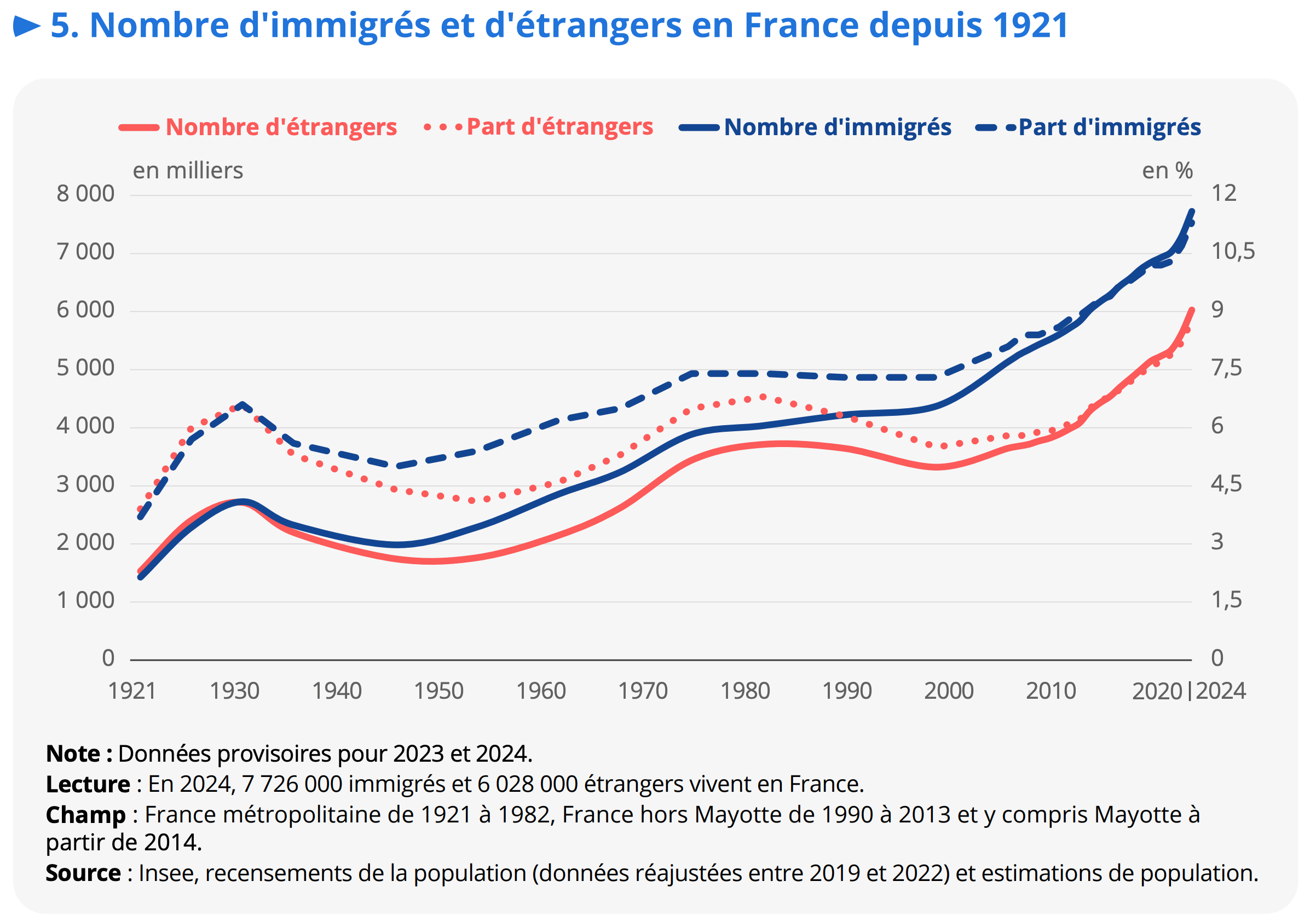 Le 7 octobre 2025, l’INSEE faisait paraître un rapport (n°2076) mettant en exergue qu’en 2024, 6,0 millions d’étrangers vivent en France, et que parmi eux, 0,9 million y sont nés.