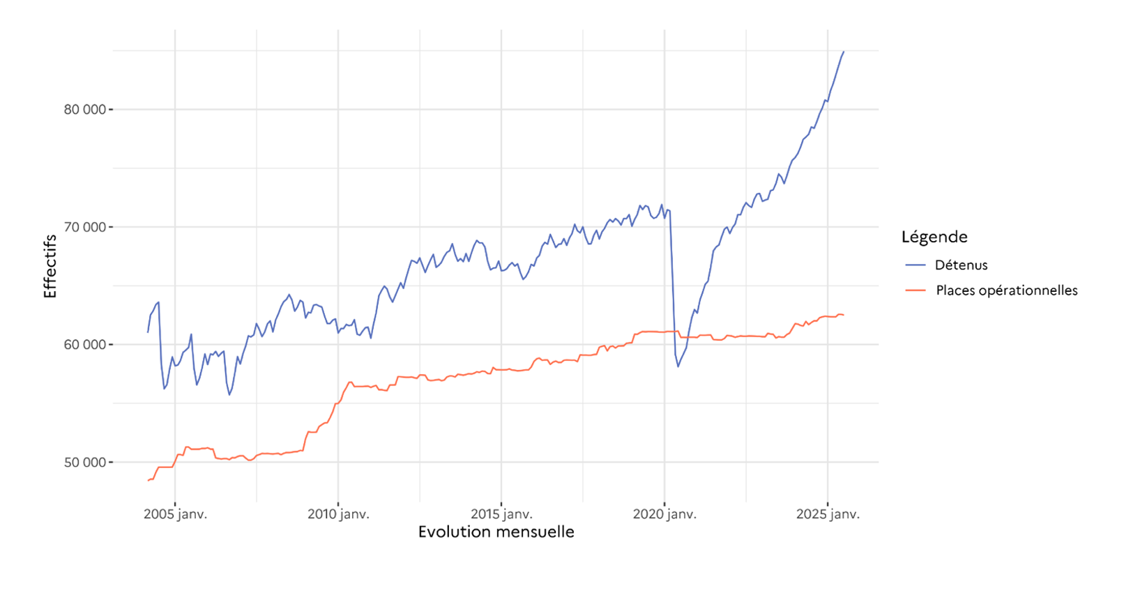 - 2025 : 84 951 détenus pour 62 509 places opérationnelles