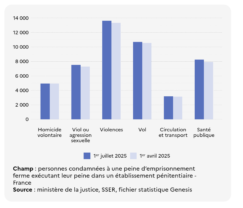 Au 1er juillet 2025, environ 53 000 personnes condamnées détenues purgent une peine d’une durée de 5 ans ou moins (+8,2% sur un an) tandis qu’environ 2 100 personnes purgent une peine de 10 ans ou plus.